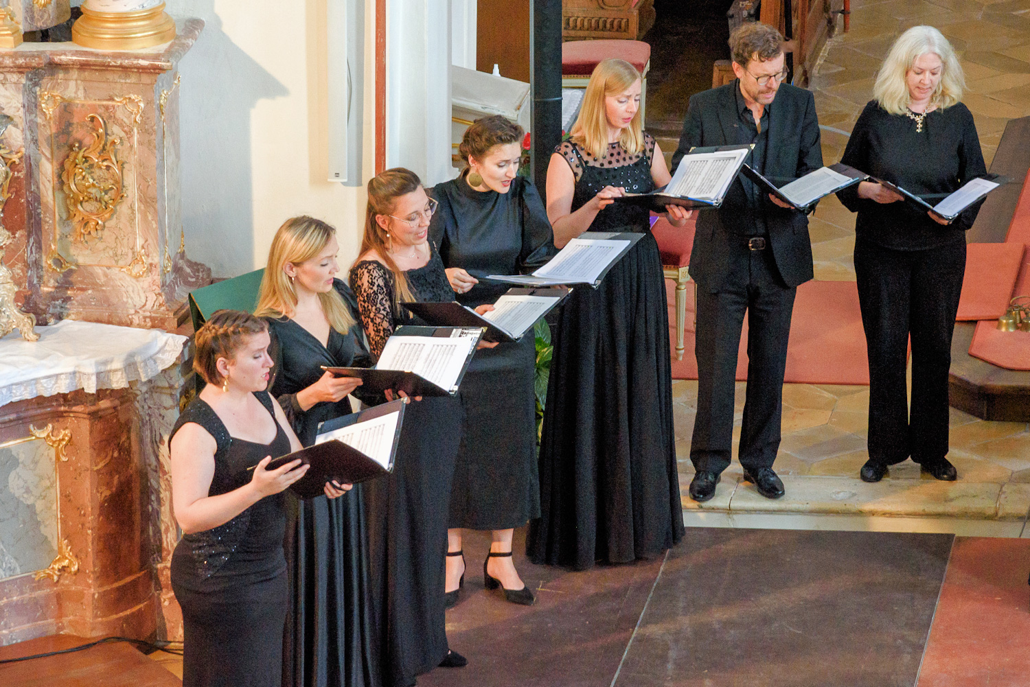 Maximilian Vogler gestaltete die Arie über das Domine Deus im Gloria als veritable italienische Belcanto-Arie, ausdrucksvoll und virtuos. Intensiv und von betörender Reinheit: das Duett „Qui tollis peccata mundi“ mit Julia Obert und Larissa Botos. Dramatisch inszeniert das Credo, überwältigend in Dichte und dynamischen Spannungsbewegungen, die in einer kunstvoll verflochtenen Fuge zu einem Höhepunkt kommen. Aus diesem moduliert Gryta Tatoryte das Offertorium hin zum Sanctus und dem Sopran-Solo „O salutatis Hostia“ mit der herrlich klaren Tongebung von Julia Obert. Die Messe endet mit dem „Agnus Dei“. Wie schön ist das denn, denkt man unwillkürlich, wenn Mezzosopranistin Larissa Botos und das Vocalensemble das „miserere nobis“ anstimmen und die Bitte um Frieden so direkt und tief empfunden singen. (BNN/BT Rezension + Fotos Martina Holbein)